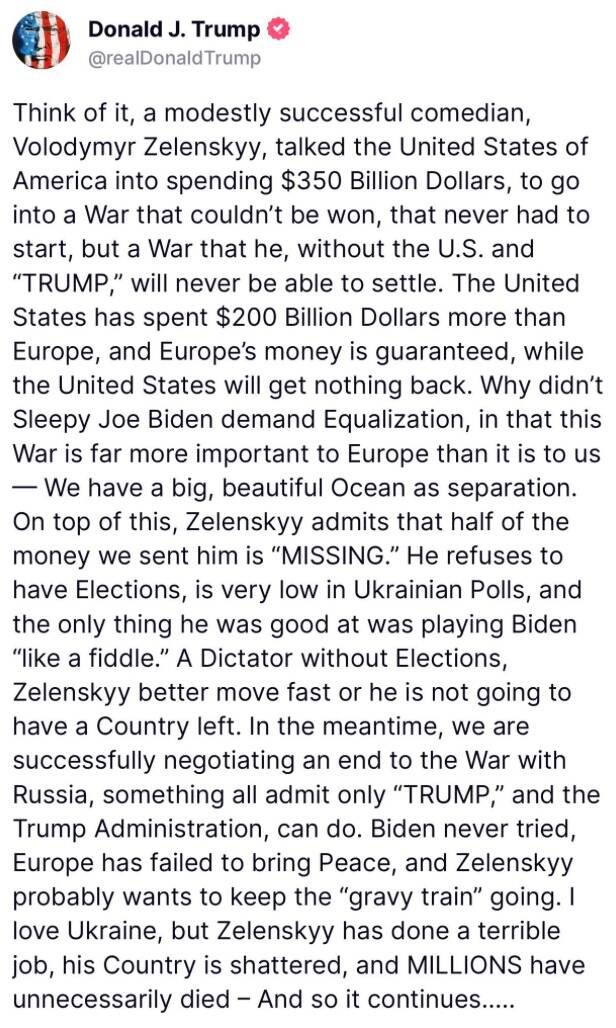 Former U.S. President Donald Trump’s recent statements about Ukraine, U.S. aid, and President Volodymyr Zelenskyy contain several inaccuracies and misrepresentations. Below is a detailed fact-check and response to these claims, backed by verified sources.
